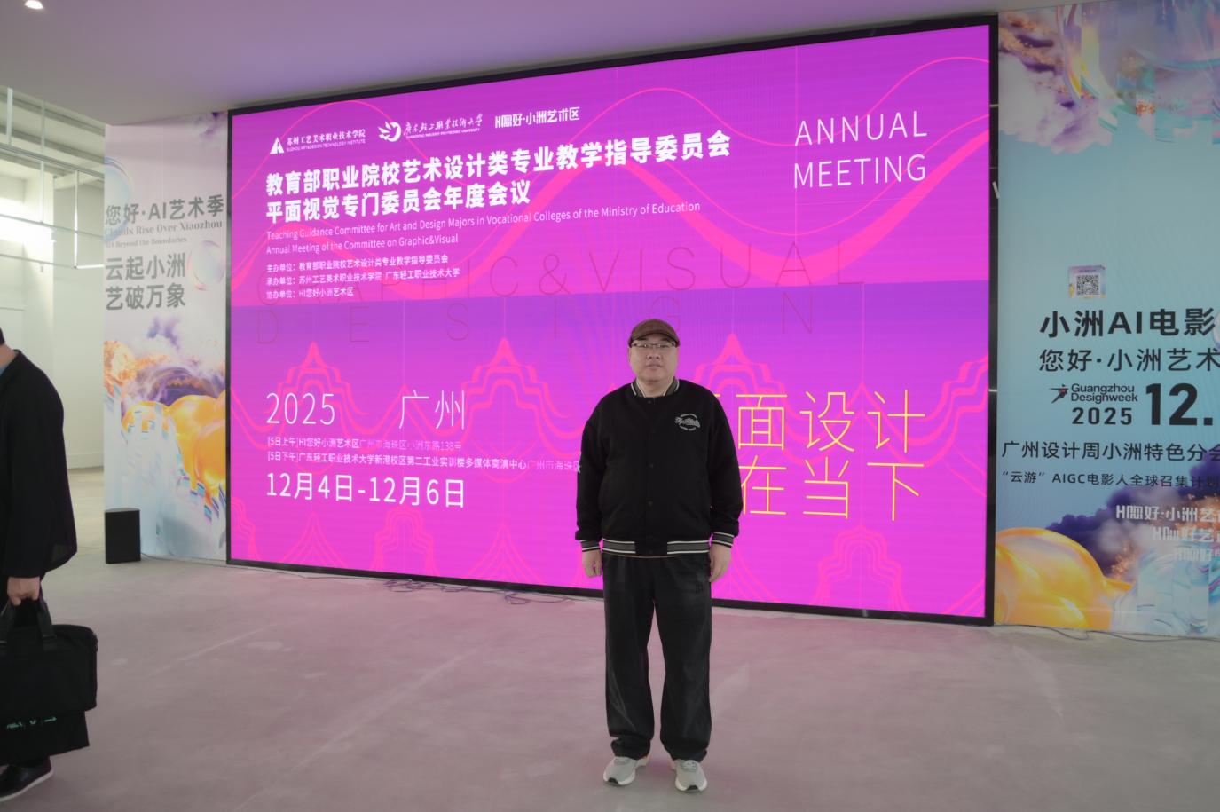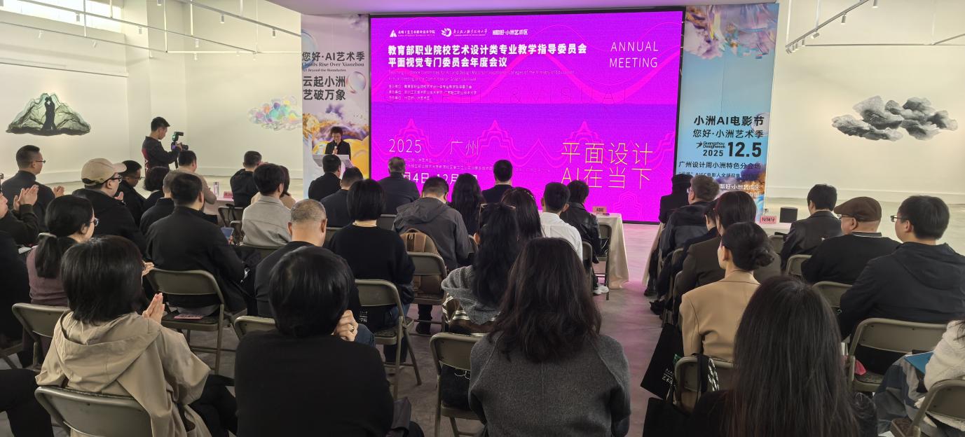 近日,2025 年教育部职业院校教学指导委员会艺术设计类平面视觉专委会工作会议在广州市 “HI 您好小洲艺术村” 及广东轻工职业技术大学盛大举行。本次会议由教育部职业院校教学指导委员会艺术设计类平面视觉专委会主办,苏州工艺美术职业技术学院(专委会主任单位)携手广东轻工职业技术大学共同承办,以“平面设计与当下的 AI 时代”为核心主题,汇聚了全国各地专委会委员代表、相关专业骨干教师及行业顶尖专家。我院赵岩峰教授作为专委会委员,应邀全程参与此次盛会,与业内同仁共商 AI 时代平面视觉设计教育的创新发展之路。