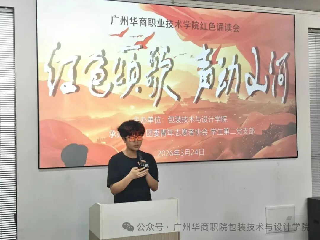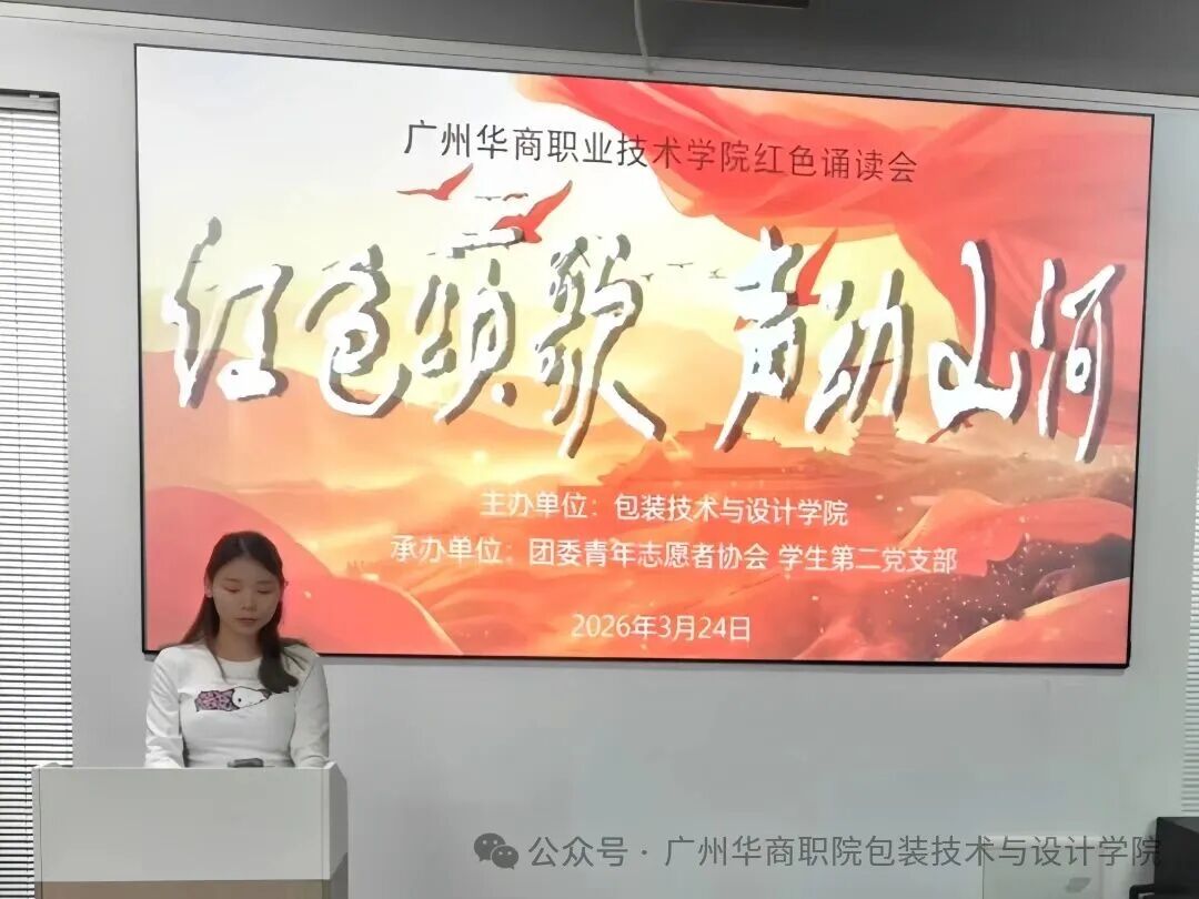 为深化党建引领作用,扎实推进”志愿服务月“主题活动,传承红色文化、厚植爱国情怀,2026年3月24日,包装技术与设计学院学生第二党支部联合学院团委青年志愿者协会(江门校区)开展了“红色颂歌,声动山河”红色朗读活动。
