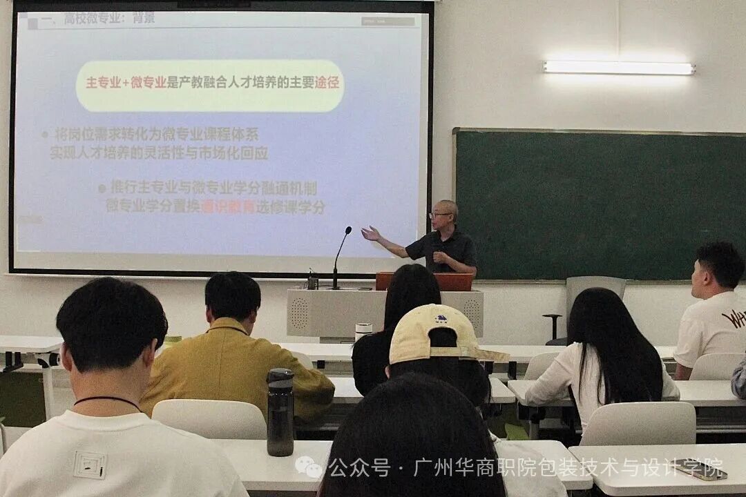 2026年4月1日,包装技术与设计学院郑志强副教授对学院全体教师,进行了“专微结合、重构融合”为主题的高等学校微专业建设专题分享讲座。