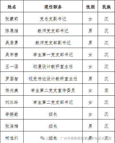 根据《关于中国共产党广州华商职业学院委员会第四次代表大会代表选举工作的通知》的相关要求,拟推荐张蒙莉等11名同志为广州华商职业学院委员会第四次代表大会代表候选人预备人选,现公示如下: