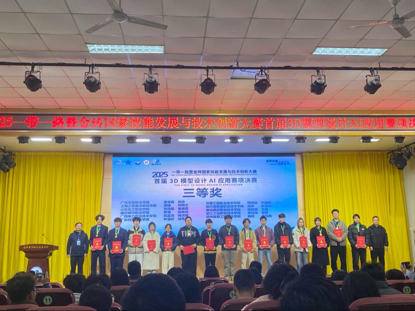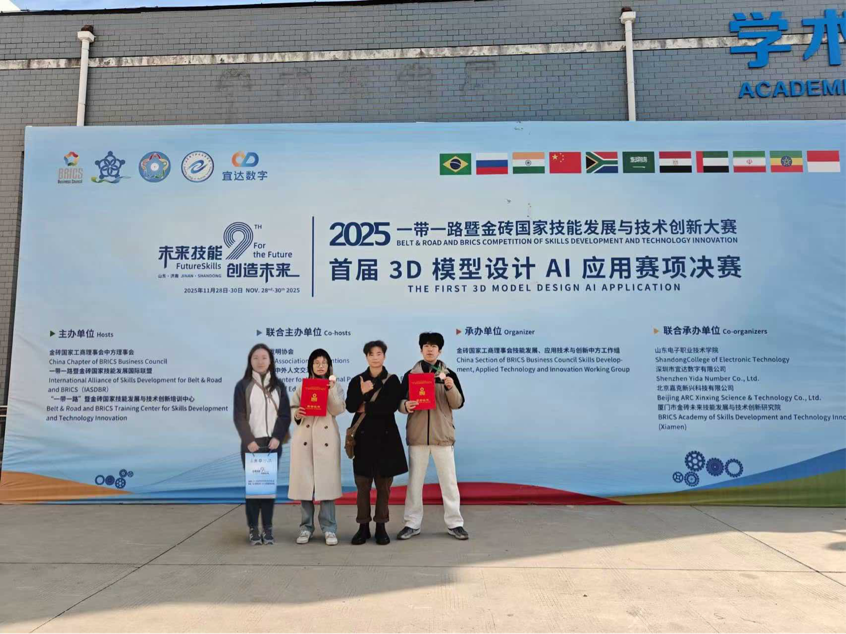 11月30日,第九届一带一路暨金砖国家技能发展与技术创新大赛首届“3D模型设计AI应用”赛项全国总决赛在山东电子职业技术学院圆满落幕。包装技术与设计学院动漫专业学生团队在激烈的竞争中脱颖而出,荣获全国三等奖,展现了专业在数字创意与人工智能融合教育领域的扎实成果。