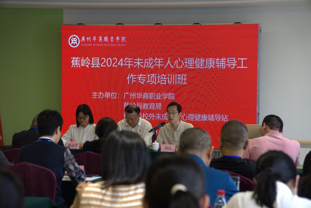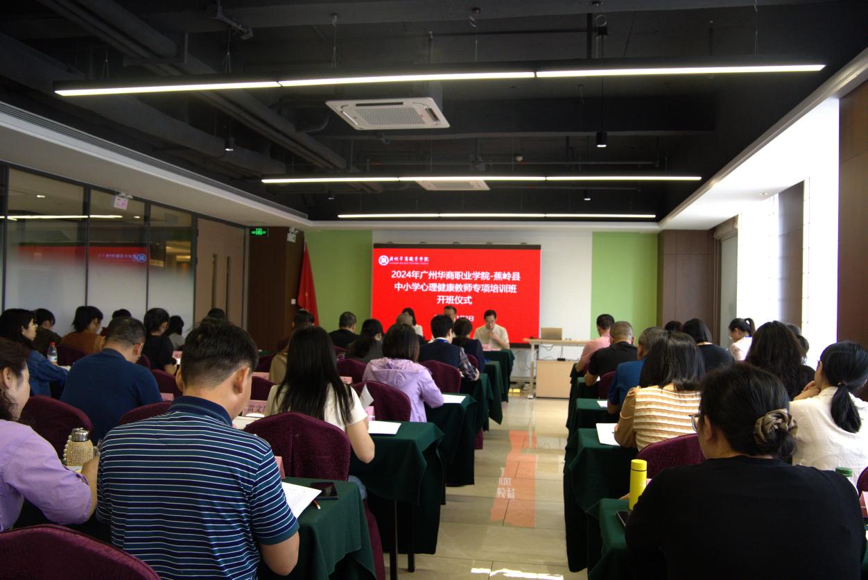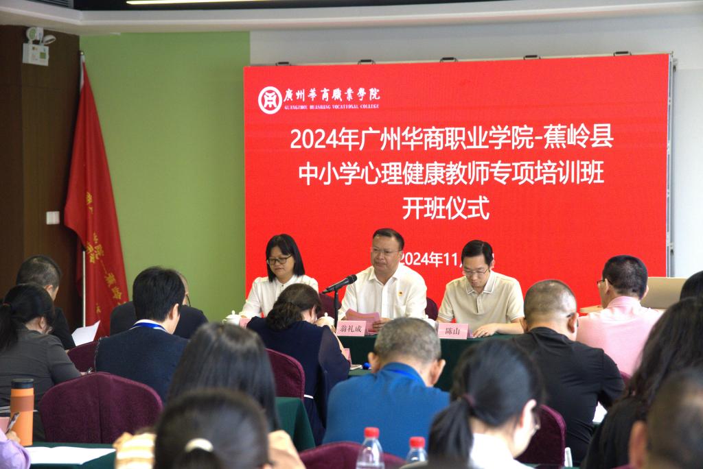 为深入落实省委省政府“1310”战略部署和省教育厅关于推进全口径全方位融入式帮扶基础教育要求,2024年11 月3日,广州华商职业学院在附属教学酒店--广州增城太阳城酒店,为蕉岭县中小学心理健康教师举办专项培训班。广州华商职业学院党委书记翁礼成教授、党务工作部潘京萍部长以及蕉岭县教师发展中心陈山副主任等领导参加了开班仪式,来自蕉岭县各中小学的53名学名参加了此次培训。