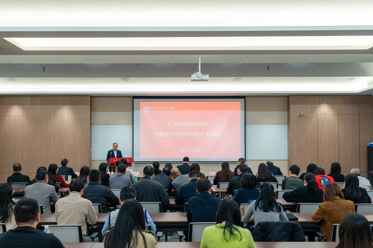 11月19日下午,广州华商职业学院党委理论学习中心组(扩大)会议在华商国际会议中心A03会议室召开。会议设广州校区主会场和江门校区分会场,线上线下同步进行。广州华商职业学院校长卢坤建等全体校领导、中层干部、党委理论学习中心组成员、教师代表等,共160人参会。会议由黄俊斌副校长主持。
