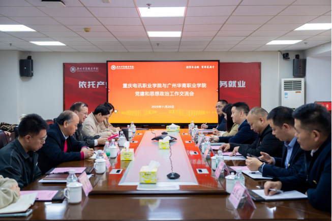 11月20日,重庆电讯职业学院党委书记兰海涛率队赴广州华商职业学院开展党建与思政工作交流,交流会在广州华商职业学院行政楼715会议室召开。重庆电讯职业学院党委书记兰海涛、校长助理杨年、党委组织人事部副部长杨静及二级学院党组织书记;广州华商职业学院党委书记翁礼成、校长助理袁晓斌、人事与质量部部长石朝阳及二级学院党组织书记代表等参与会议。会议由广州华商职业学院党委书记翁礼成主持。