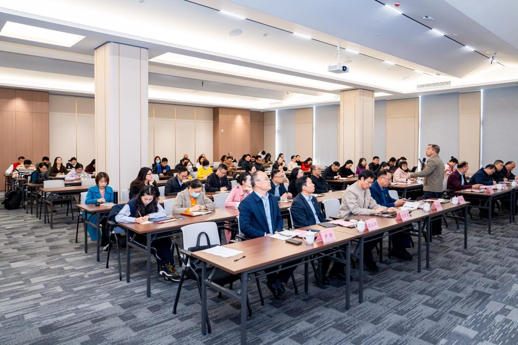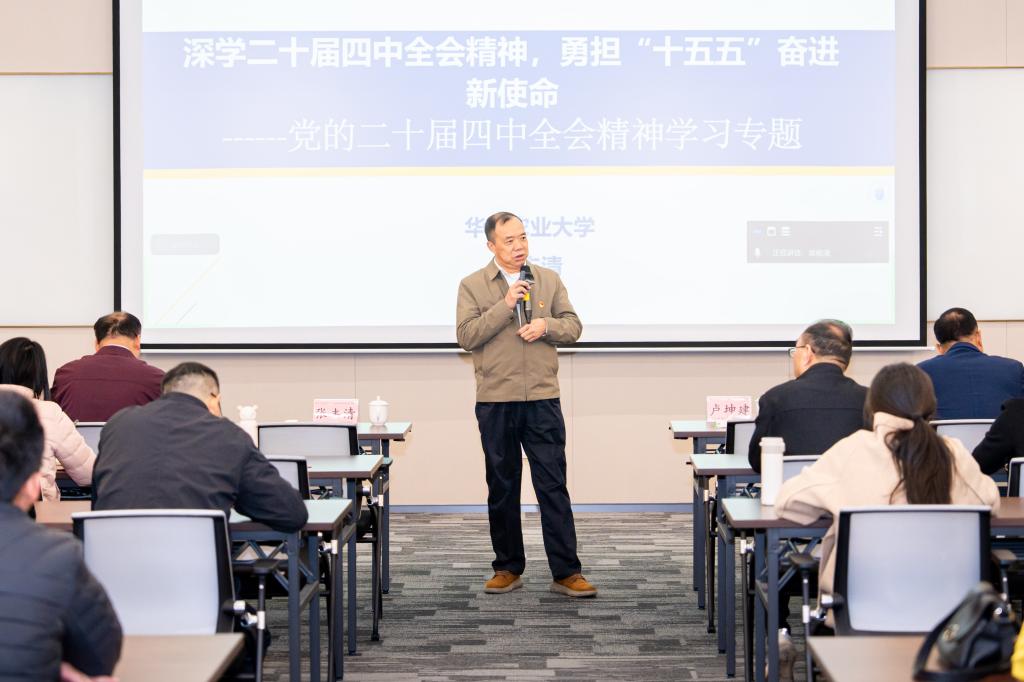 为深入学习贯彻党的二十届四中全会精神,12月15日,广州华商职业学院在广州校区华商会议展览中心4楼A03会议室召开了党委理论学习中心组(扩大)会议,江门校区线上同步参与。学校领导、中层干部、党委理论学习中心组成员以及各二级单位教师代表共同参与。会议由翁礼成书记主持并特别邀请了华南农业大学马克思主义学院张丰清教授作题为《深学党的二十届四中全会精神,勇担“十五五”奋进新使命》的辅导报告。