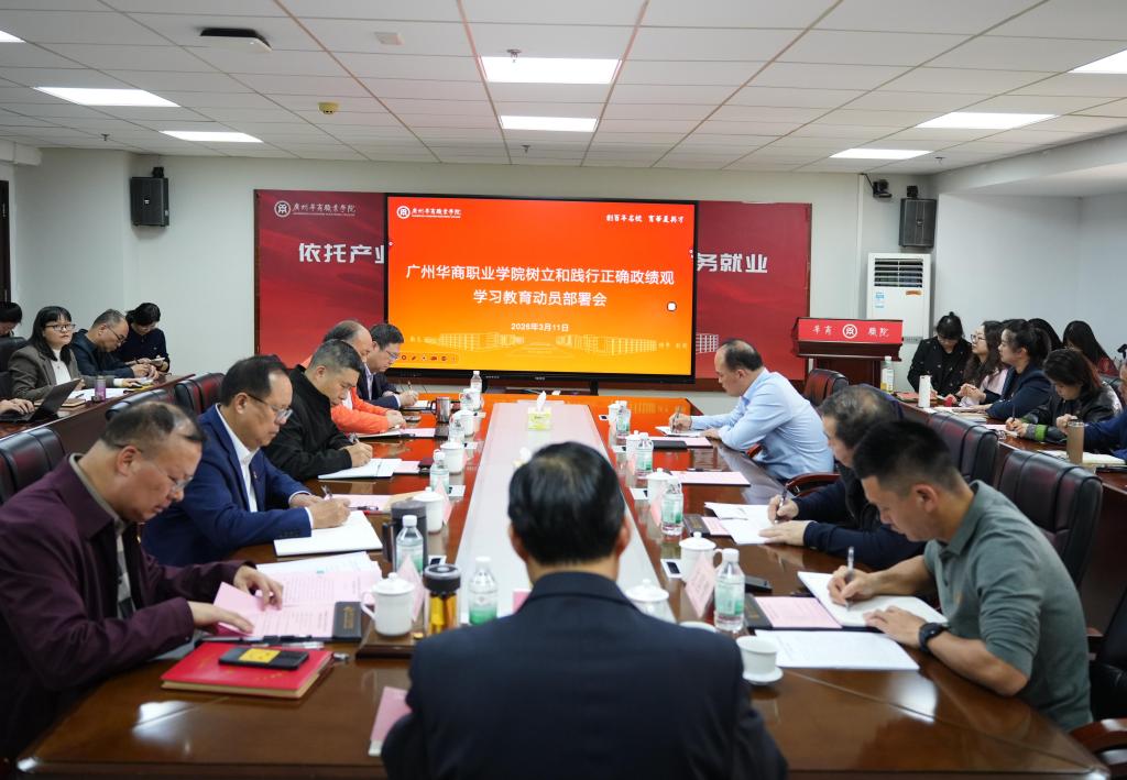 3月10日上午,广州华商职业学院召开树立和践行正确政绩观学习教育动员部署会,深入学习贯彻习近平总书记关于树立和践行正确政绩观学习教育的重要讲话和重要指示精神,落实党中央和省委关于开展学习教育的部署要求,党委书记翁礼成主持会议并作动员讲话。党委副书记、校长卢坤建,党委副书记、纪委书记、常务副校长袁国繁,学校党委委员、领导班子成员、全体中层干部,学校树立和践行正确政绩观学习教育工作专班全体成员参加会议。