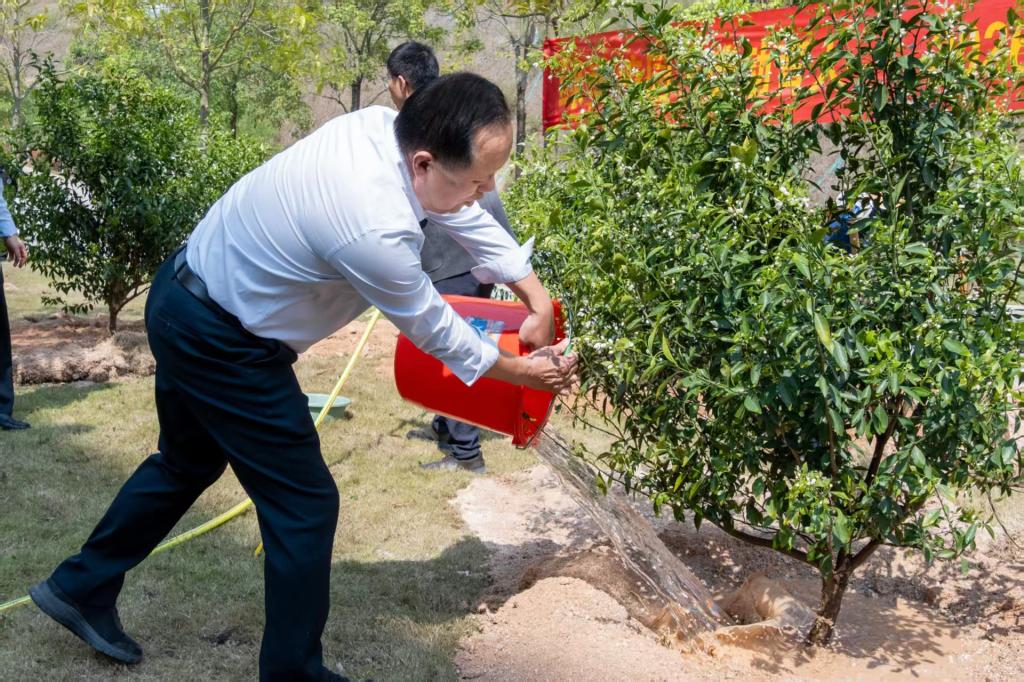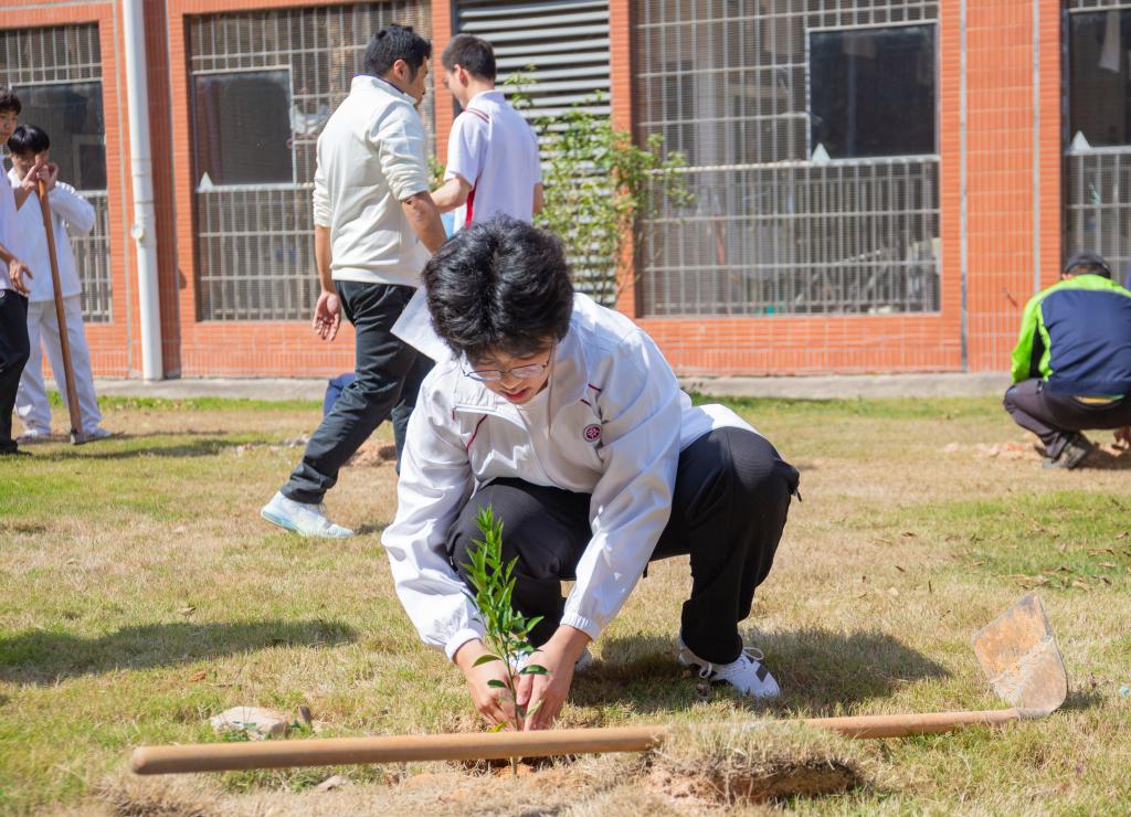 师生们分工协作、配合默契。挖坑、扶苗、培土、浇水,每一个环节都有条不紊。江门校区综合办老师及劳动教育课程教师穿梭其间,悉心指导;同学们三两成组,互相配合,或蹲身培土,或提桶浇水,现场气氛热烈而有序。