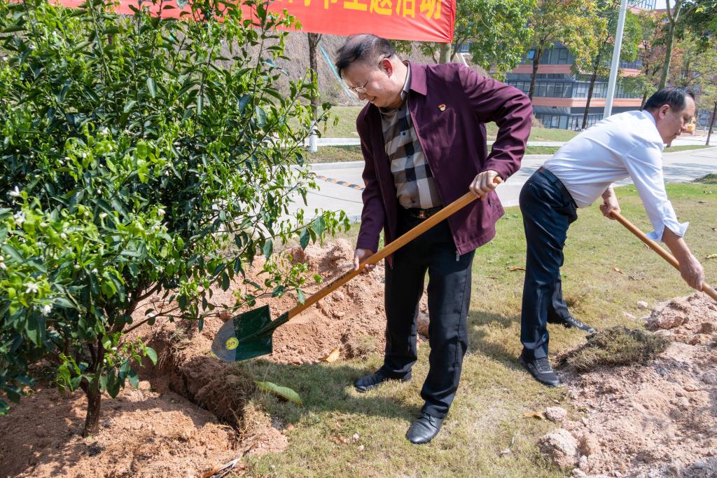 草木蔓发,春山可望。3月12日,在广州华商职业学院江门校区4号楼中庭,一场以绿美校园·劳动育人为主题的劳动教育实践课生动开讲。校长卢坤建、党委书记翁礼成、常务副校长袁国繁、副校长黄俊斌、孙虎亲临现场,与通识与教育学院、江门校区综合办公室、党委组织统战部、党委宣传部、学务部、校园服务中心等部门负责人、劳动教育课程教师及百余名学生一同挥锹培土,栽种新绿,以实际行动践行绿色发展理念,深化劳动育人内涵。
