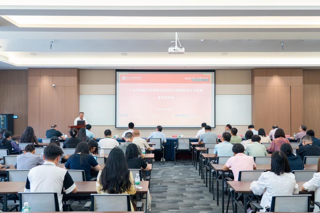 为深入学习贯彻习近平总书记关于树立和践行正确政绩观的重要论述,精准把握“十五五”时期我国发展环境深刻复杂变化,4月8日下午,广州华商职业学院在华商会议展览中心A05会议室召开党委理论学习中心组(扩大)会议,同步举行树立和践行正确政绩观学习教育读书班开班式暨第一讲专题学习,江门校区线上同步参与。校领导、中层干部、党委理论学习中心组成员及各二级单位教师代表参会,会议由学校党委书记翁礼成主持。