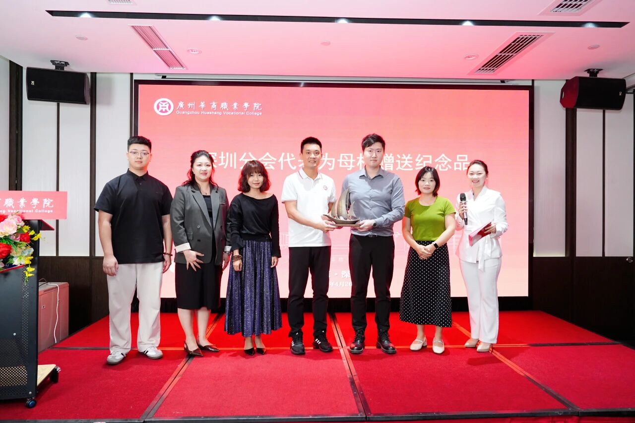 深圳分会发起人江浩生、郭刘纯玲、邱嘉颖、马玲、张茹、郑弘淇校友为母校精心准备了纪念品,袁国繁代表学校郑重接过这份纪念品,全场响起了热烈的掌声。这件承载着美好寓意的礼物,藏着每一位深圳校友对母校的牵挂与祝福——愿母校的育人航船乘风破浪,在职业教育的新征程上行稳致远,桃李芬芳,再谱华章。