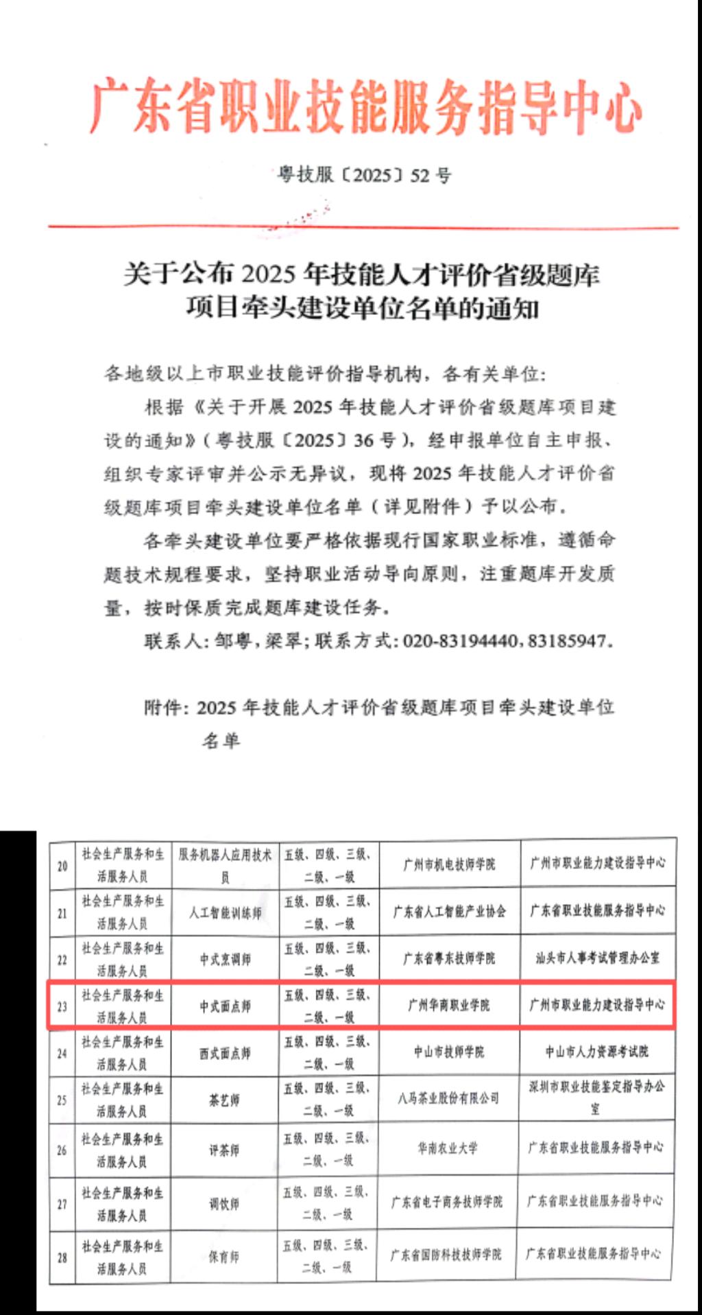 近日,广东省职业技能服务指导中心印发《关于公布2025年技能人才评价省级题库项目牵头建设单位名单的通知》(粤技服 〔2025〕 52号),广州华商职业学院凭借专业优势与综合实力,成功立项成为2025年技能人才评价省级题库牵头建设单位,将负责“中式面点师”职业(工种)的省级题库建设。