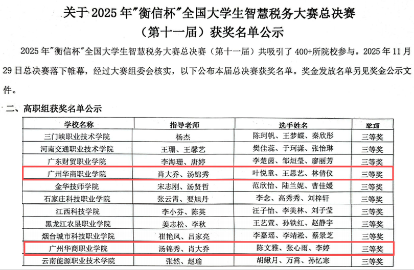 近日,2025年“衡信杯”全国大学生智慧税务大赛总决赛在江西财经大学圆满落幕。我校低空经济与商务学院两支晋级队伍凭借扎实的专业能力与出色的团队协作,从全国众多高校中脱颖而出,双双荣获总决赛三等奖,展现了学院在财税人才培养方面的扎实成果。