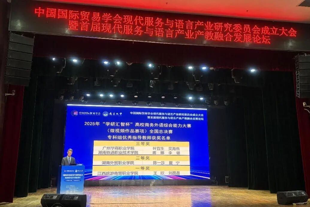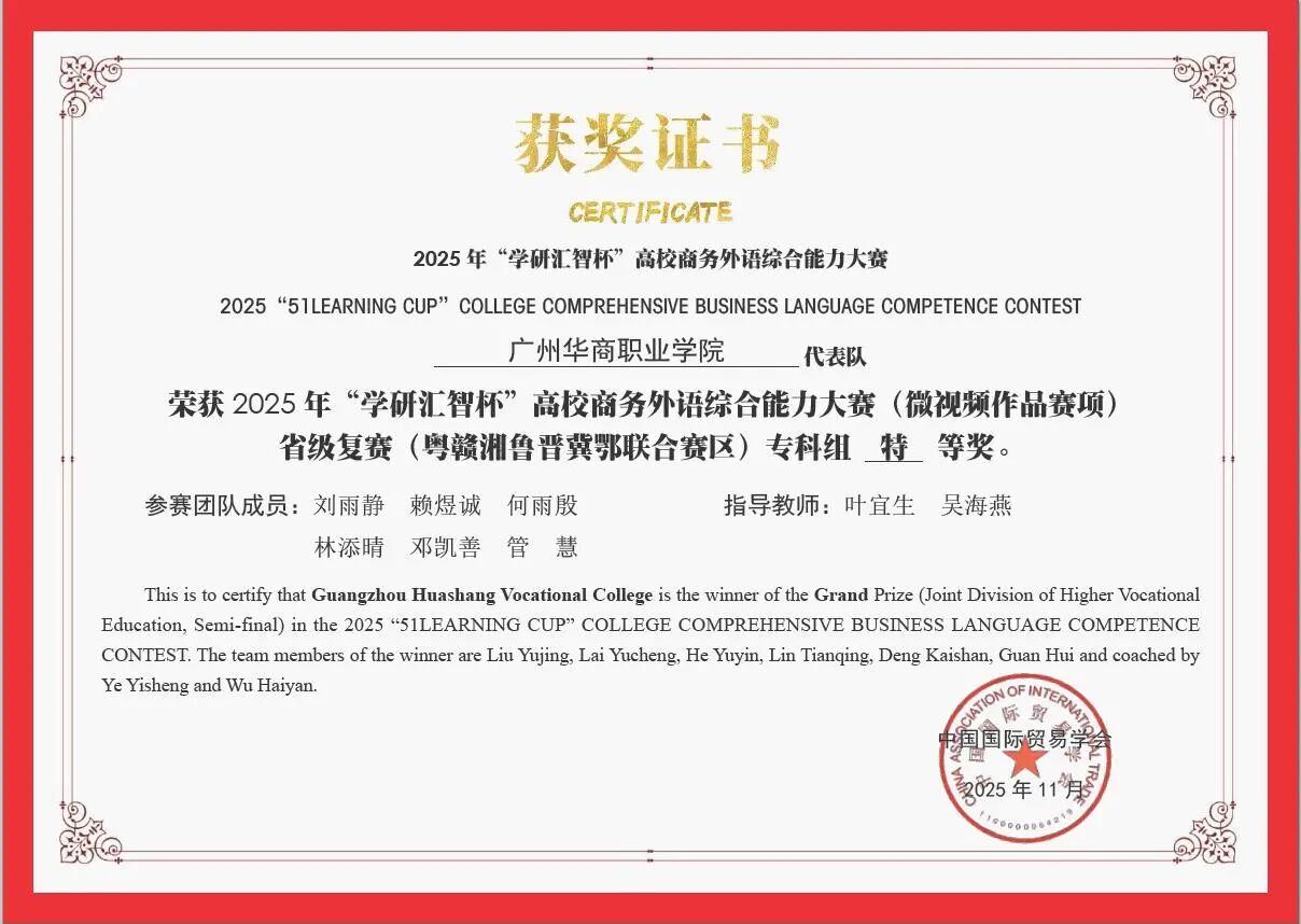 2025年12月27日,由中国国际贸易学会主办的“学研汇智杯” 高校商务外语综合能力大赛全国总决赛圆满落幕。广州华商职业学院通识与教育学院学子组成的参赛团队,凭借省赛特等奖(第一名)的硬核实力晋级国赛,最终斩获全国总决赛总成绩三等奖、专科组第二名的优异战绩,刷新我校在该赛项的历史最佳纪录。同时,学校荣获“最佳组织奖”,叶宜生副教授、吴海燕老师获评 “优秀指导老师”,全方位彰显了学校商务外语人才培养的扎实功底与鲜明特色。