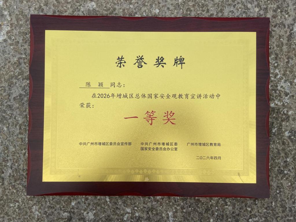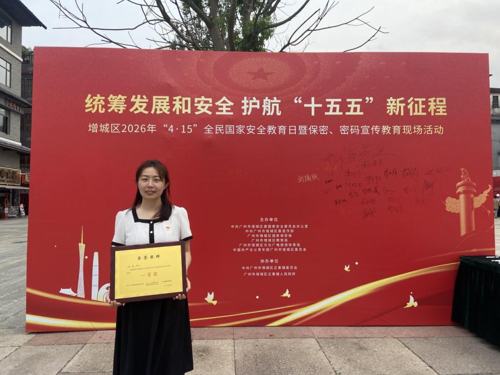 4月10日,2026年增城区总体国家安全观“进乡村”启动暨保密、密码宣传教育月现场活动在正果镇正果老街举行。活动现场,区委国安办为本次宣讲评选获奖教师举行颁奖仪式。陈颖老师受邀面向现场群众开展国家安全观主题宣讲展示,以接地气、有温度的方式普及国家安全知识,获得在场人员一致认可。凭借出色的宣讲能力与专业素养,陈颖老师正式受聘为增城区总体国家安全观教育宣讲团成员。
