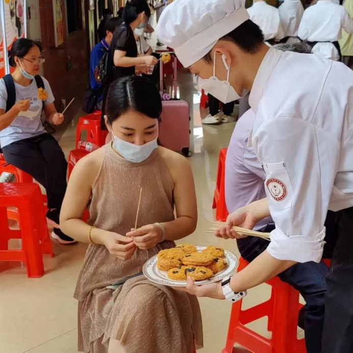 基于疫情防控的要求和维护报到现场秩序的条件下,家长们并不能陪同新生们进入报到处报到。在家长们等待的过程中,酒店管理学院拿出最好的待客之道。邀请家长们品尝我院中西面点专业学生制作的糕点。希望糕点甜意能为家长们在稍许繁杂的环境中带来一丝甜意。也希望能让家长们 更加了解学院的专业内容。
