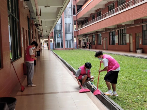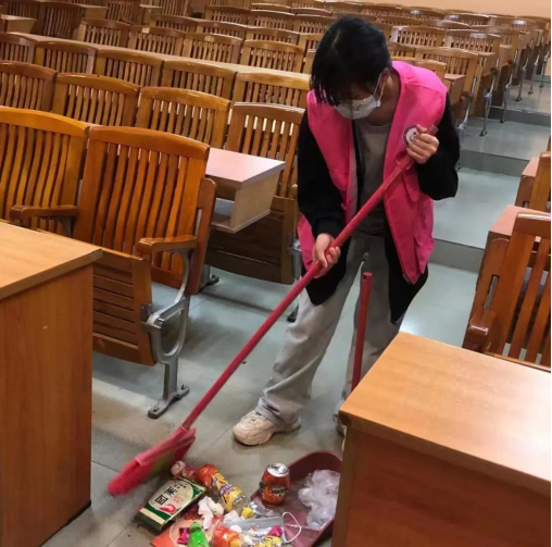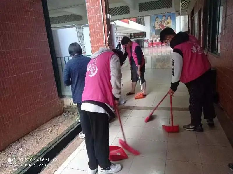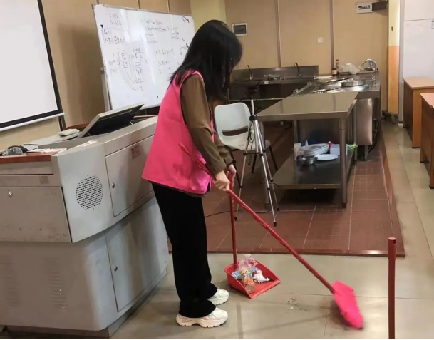 下课铃声响起,志愿者们迅速赶到创新楼一楼集合,穿戴志愿服并有序进行签到。负责人提前进行了任务分配,每个同学负责打扫不同的区域。