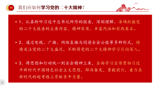 党的二十大是在全党全国各族人民迈向全面建设社会主义现代化国家新征程、向第二个百年奋斗目标进军的关键时刻召开的一次历史性盛会,青年干部要扎实学习党的二十大报告中新观点、新论断、新部署,要原原本本、原汁原味进行逐字逐句学习,务必不忘初心、牢记使命,务必谦虚谨慎、艰苦奋斗,务必敢于斗争、善于斗争。坚定历史自信,增强行动自觉,以更昂扬、更饱满的奔跑姿态投身火热的社会主义现代化建设新征程。