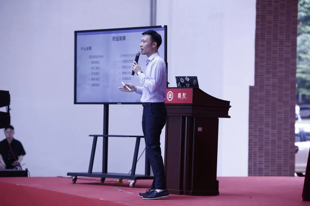 随后,教师代表陈国斌老师为大家分析了近几年酒店行业发展的趋势,引用自身实践案例分享了个人的从业经验,启迪新同学思考大学的职业生涯与学习规划。陈国斌老师积极地与同学交流互动,耐心地为新生们解答专业方面的问题,赢得了现场热烈的掌声。