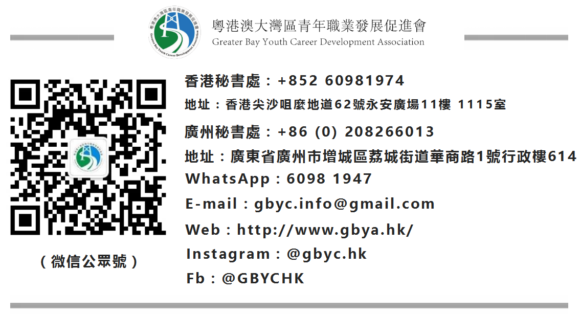 粤港澳大湾区青年职业发展促进会由华商教育集团副董事长廖伊曼女士于2018年7月创立,并由霍启山先生与庄家彬先生担任荣誉主席。我们的使命是在学习、实习、交流、就业、创业5个方面都做到“A级”,帮助港澳青年开阔眼界、了解内地的最新发展情况、在大湾区发挥所长并实现理想。同时,青促会将联合社会各界共同参与“9+2”大湾区城市群建设,为湾区输送优秀人才而努力,为将粤港澳大湾区建立成为世界一流的湾区而努力!