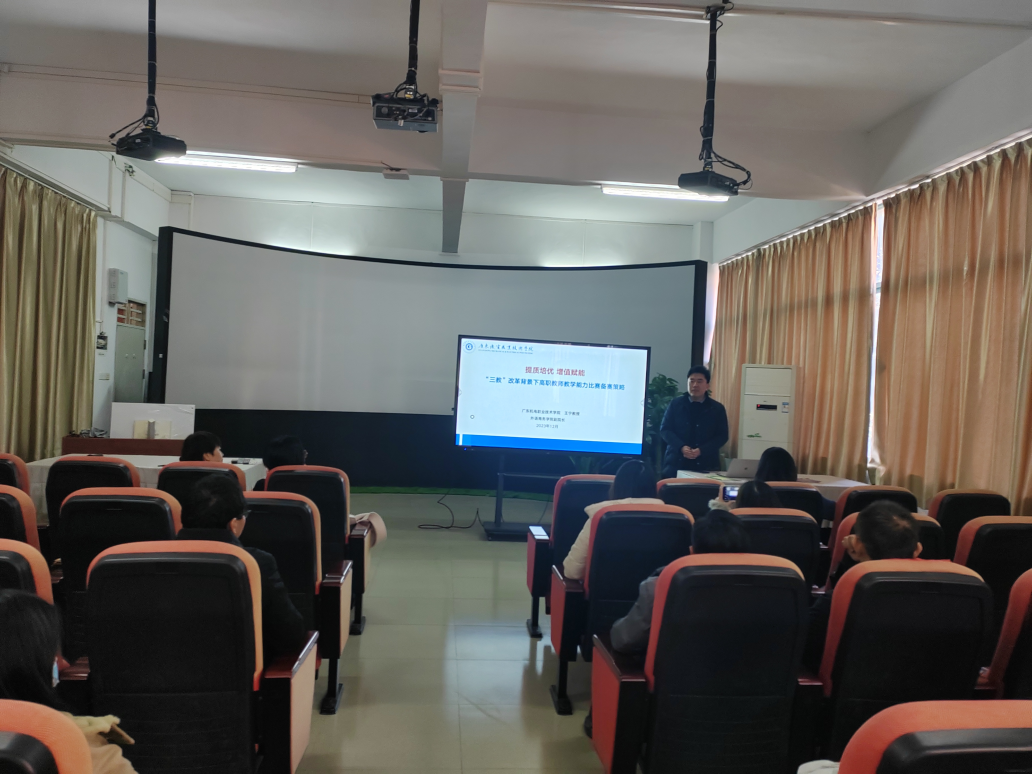12月22日下午,根据学校关于组织开展教学专题系列讲座的通知要求,我院特邀广东机电职业技术学院外语商务学院副院长王宁教授、李艳丽老师在创教311举办《教学能力大赛备赛技巧与策略》专题讲座。酒店管理学院院长林红梅教授出席、学院全体教职工参加此次报告会,讲座由副院长刘慧娟主持。