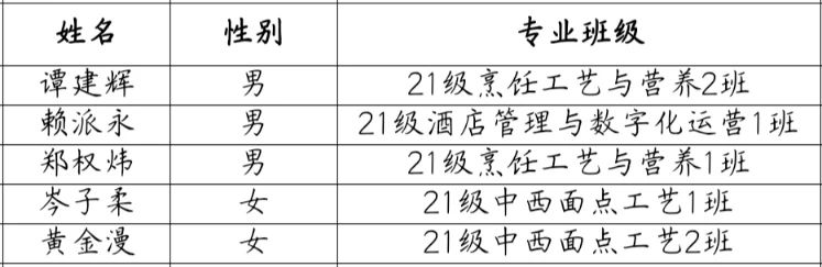 根据《广州华商职业学院关于做好2024届优秀毕业生评选工作的通知》(华商职〔2024〕11号)要求,切实做好新形势下大学生思想政治工作,发挥优秀大学生的示范激励引领作用,进一步引导大学生树立正确的成长观和择业观,促进形成良好的校风、学风,经酒店管理学院研究决定拟推荐谭建辉等5位同学为酒店管理学院2024届优秀毕业生(具体名单如下):