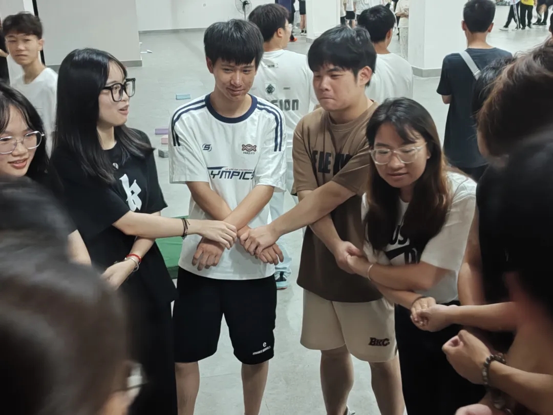 在班助和班长的组织下,同学们被分成多个小组,参与了一系列充满挑战和乐趣的团队拓展活动。活动包括了“二人三足接力赛”、“不倒森林”和“解手链”等精彩游戏。现场洋溢着激情与活力,掌声和欢呼声交织,洋溢着欢声笑语。