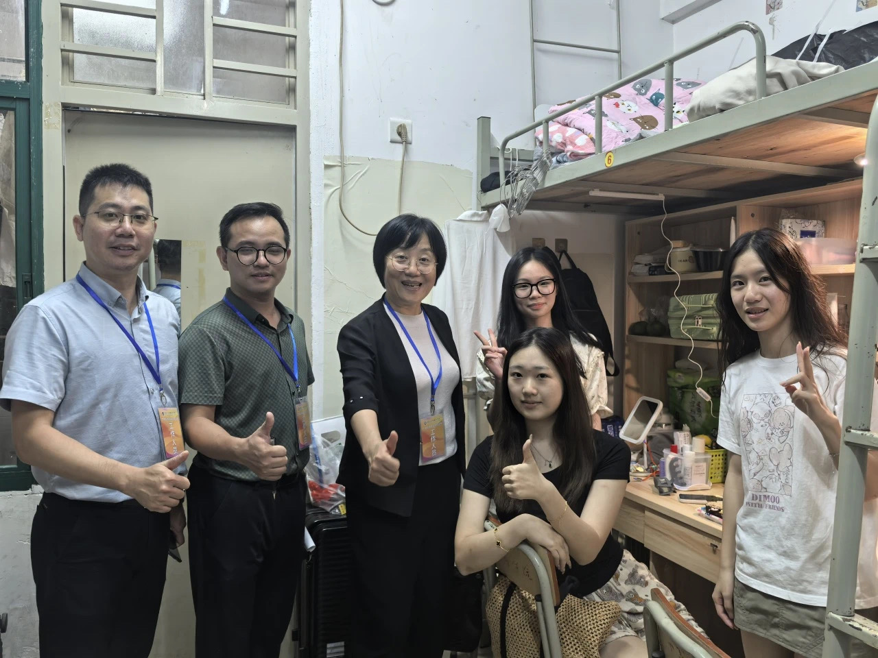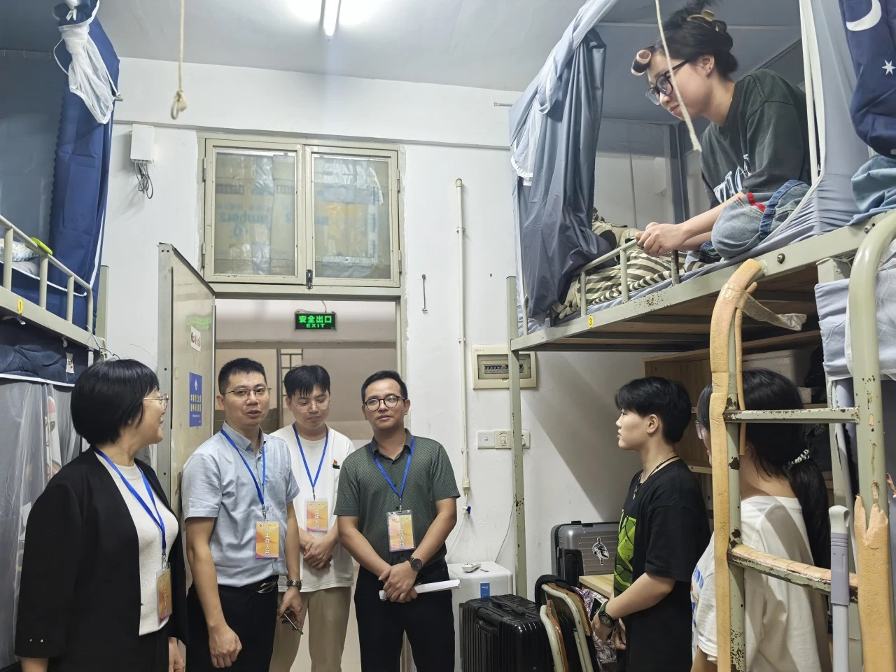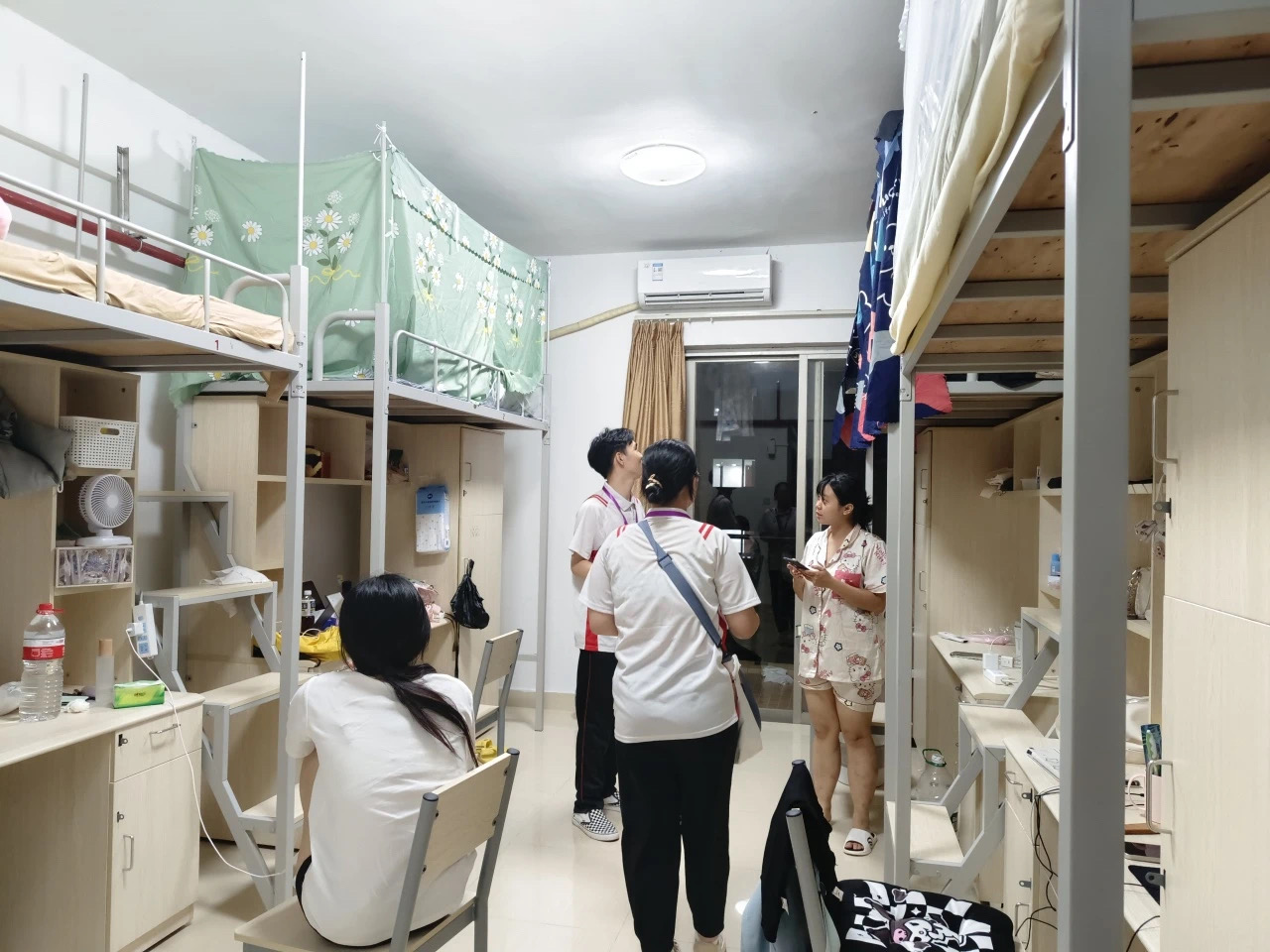 为了深入了解2024新生入学情况,倾听他们的心声,帮助新生更快地融入大学生活,营造温馨的生活与学校环境,8月30日晚上,酒店管理学院林红梅院长、谢锦权副院长、何洪健副院长、团委副书记陈海宁老师及新生辅导员黄向荣带领各班班助走访新生宿舍,带去温暖的问候和深切的关怀。