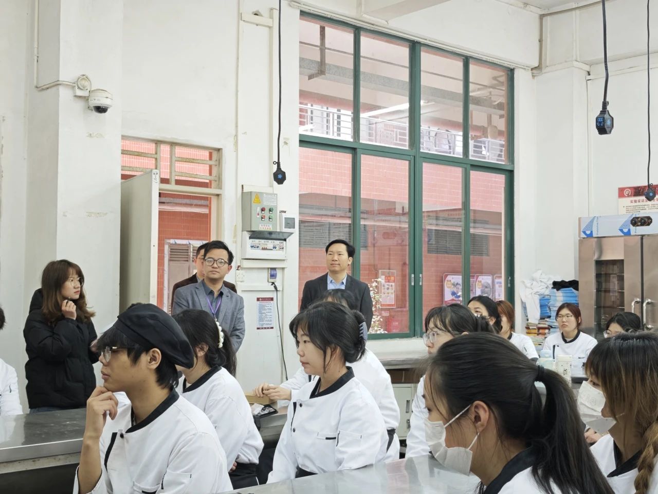新学期开学第一课教学巡查除了关注校本部的教学情况外,我院领导、老师还重点巡查了在太阳城附属教学酒店开展实践学习的班级情况。酒店管理学院院长林红梅、副院长何洪健、谢锦权以及辅导员、“双岗”教师们与24级烹饪工艺与营养1班全体同学进行了面对面的互动。