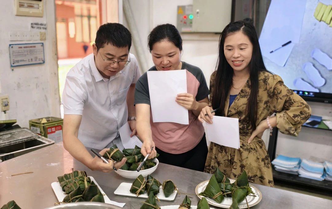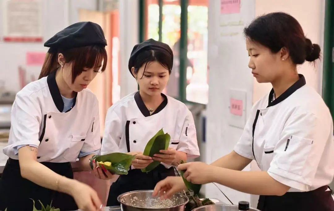 活动伊始,同学们围坐在一起,面点专业宁丰贤老师亲自示范粽子的包法。从挑选粽叶、浸泡糯米,到包裹馅料、缠绕粽绳,每一个步骤都蕴含着传统智慧。同学们聚精会神地观察,生怕错过任何一个细节。随后,大家迫不及待地动手实践,尽管手法略显生疏,但一个个形状各异的粽子在欢声笑语中诞生。有的粽子像小巧玲珑的三角塔,有的则像胖乎乎的小枕头,虽然模样不同,但都承载着同学们对传统技艺的热爱与尊重。