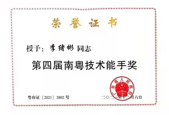 为大力弘扬劳模精神、劳动精神、工匠精神,树立技能典型,经广泛动员、推荐评选,广东省人民政府决定授予李绪彬同志第四届南粤技术能手奖。