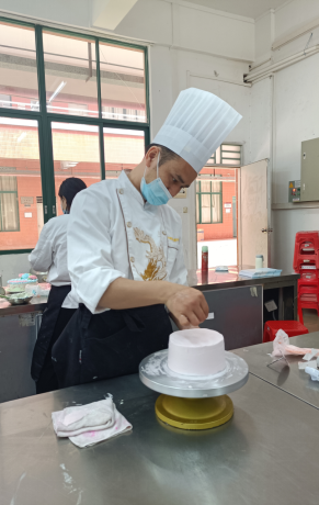 范老师示范过后学生们积极练习,范老师在一旁指导改正学生们在裱花过程中的错误手法以及辅助学生完成蛋糕裱花。在老师的指导和同学们的积极配合下,这次裱花工艺实践课圆满结束。