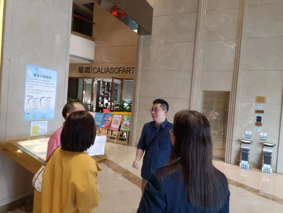 老师们到达太阳城附属教学酒店后,由酒店经理带领我院老师分组进行各教学模块的实地考察。院长助理周期带领专任教师们分别考察了附属教学酒店的中餐厅、宴会厅、西餐厅、客房、前厅等功能区,并逐一核对相关教学设备设施。党支部书记谢锦权带领学工团队考察了学生食堂、自修室、宿舍区、课余休闲场所等。