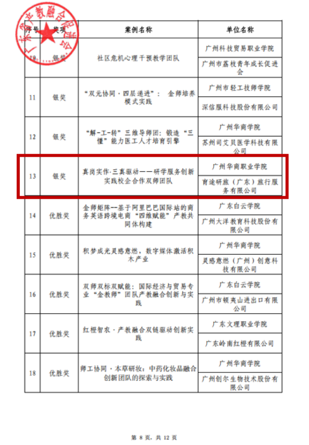 由酒店管理与厨艺学院与育途研旅(广东)旅行服务有限公司合作申报的《真岗实作·三真驱动--研学服务创新实践校企合作双师团队》案例,酒店管理与厨艺学院旅游管理专业方雪老师与育途研旅(广东)旅行服务有限公司韦红燕总经理作为团队代表完成现场展示,荣获“金教师”类别银奖。该案例聚焦于“双师型”教学团队的建设,通过“真实项目、真实岗位、真实流程”的“三真”驱动,校企共同打造了一支既精通理论教学又熟悉行业实践的优秀教师团队,为研学旅行服务与管理等领域的人才培养提供了有力支撑。