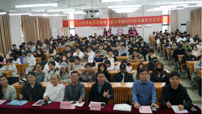 为促进毕业生高质量实习与就业,搭建毕业生与用人单位供需见面平台,11月19日下午,酒店管理与厨艺学院在博C201举行2026届毕业生企业宣讲会。7家知名企业代表入校招聘宣讲,宣传企业文化、剖析企业核心竞争力,讲解实习岗位需求与职责,并描绘清晰的职业晋升蓝图。酒店管理与厨艺学院副院长何洪健、谢锦权,专业负责人及专任教师代表、全体辅导员以及2026届毕业生200多人参加了活动。