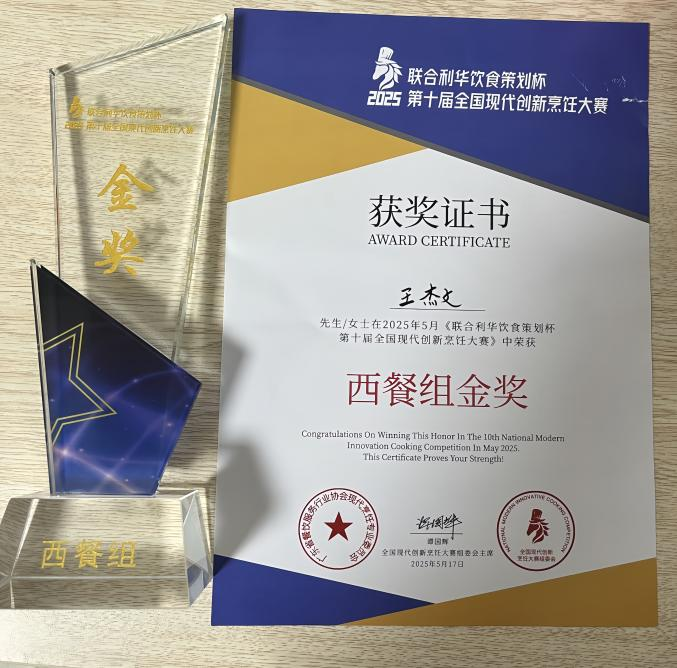 2025年5月17日,广州华商职业学院酒店管理学院附属教学酒店·太阳城大酒店的西式烹饪教师王杰文凭借精湛的技艺和出色的创新能力,在西餐组中脱颖而出,一举斩获金奖,为学院和酒店赢得了极高的荣誉。
