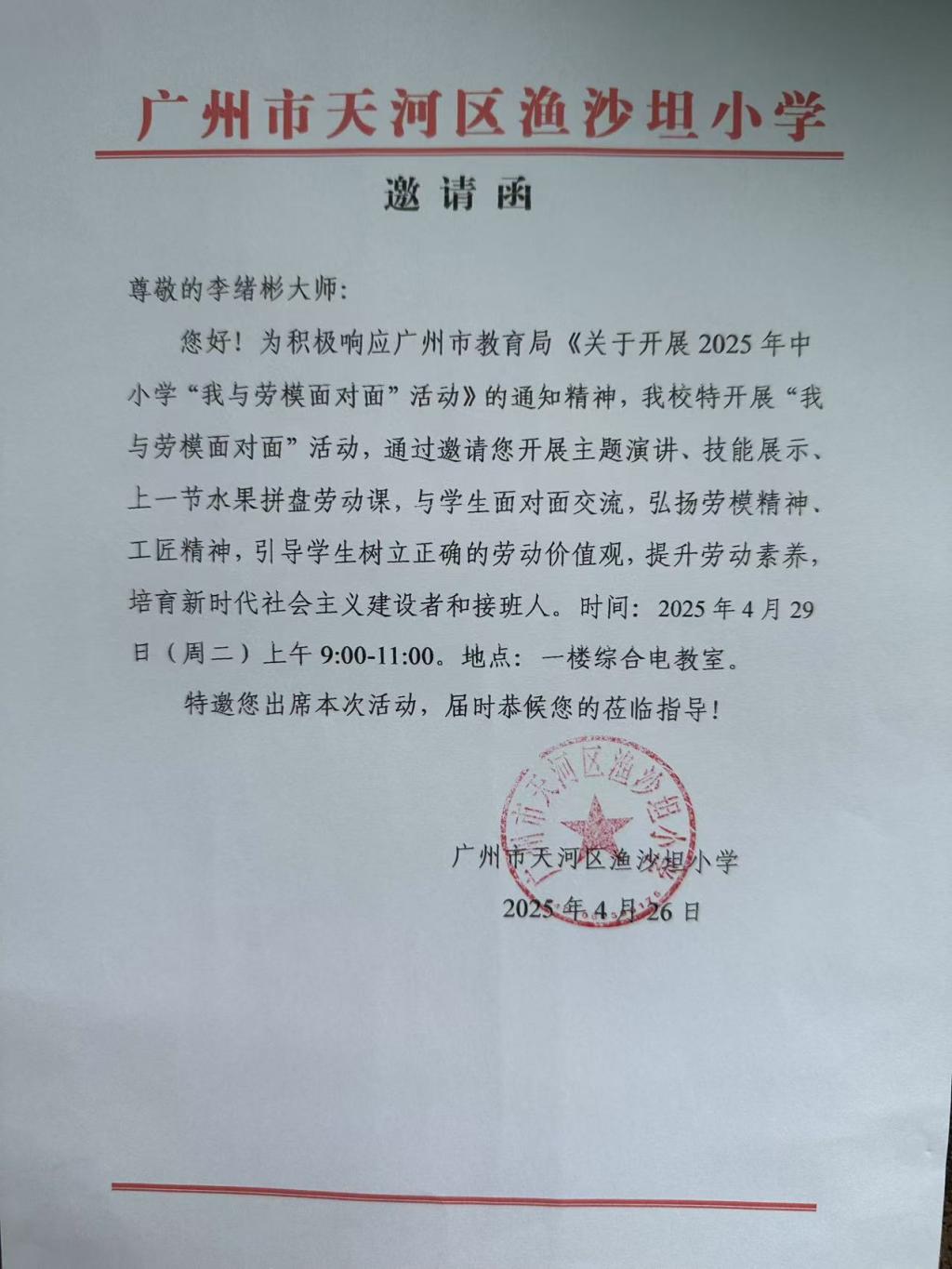 为深入贯彻落实广州市教育局《关于开展2025年天河区中小学“我与劳模面对面”活动》的通知精神,推动新时代劳动教育的实践与创新,弘扬劳模工匠精神,提升学生职业素养与实践能力,近日,广州华商职业学院联合天河区渔沙坦小学共同举办了“匠心烹艺,薪火传香——我与劳模面对面”主题活动。活动特邀我院正高级工程师、国家中式烹调高级技师、广东省“南粤技术能手奖”获得者、中国烹饪大师李绪彬担任主讲嘉宾,为师生们带来了一场精彩纷呈的劳动教育实践课。