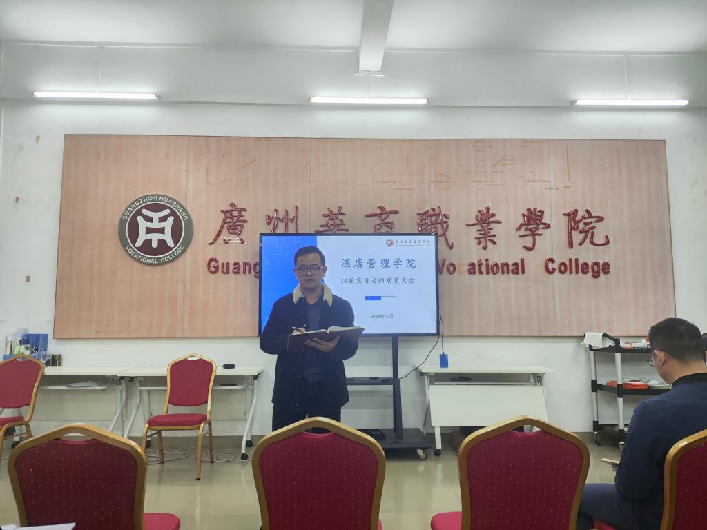 此外,何洪健副院长还详细解读了 2024 届学生实习工作方案。他向各位实习指导老师介绍了本次实习的整体安排,包括实习时间、实习酒店分布、实习岗位设置等方面的内容。同时,对实习指导老师的工作任务和要求进行了具体部署,明确了实习指导老师在实习前、实习中、实习后的各项工作职责,如实习动员、实习单位联系与协调、实习过程监督与指导、实习成绩评定等。副院长还强调了实习安全管理的重要性,要求指导老师们务必将安全教育贯穿于实习工作的始终,确保学生在实习期间的人身安全和财产安全。