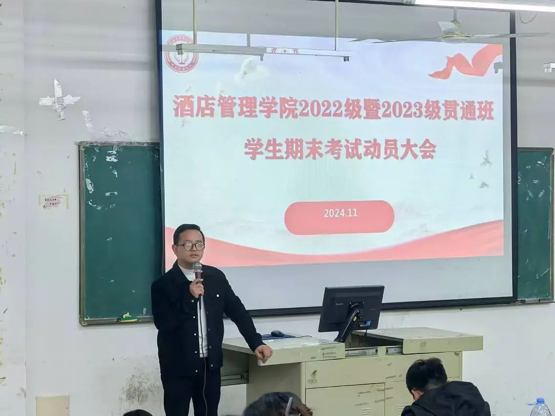 为了提高学生对诚信考试的认识,强化考试纪律,确保期末考试的公平性和公正性。酒店管理学院于2024年11月28号晚上20:00在博C201教室召开2022级、2023级贯通班学生期末考试考试动员大会。此次动员大会由何洪健副院长主讲,辅导员黄向荣、陈海宁老师及2022级、2023级贯通班全体同学参与。