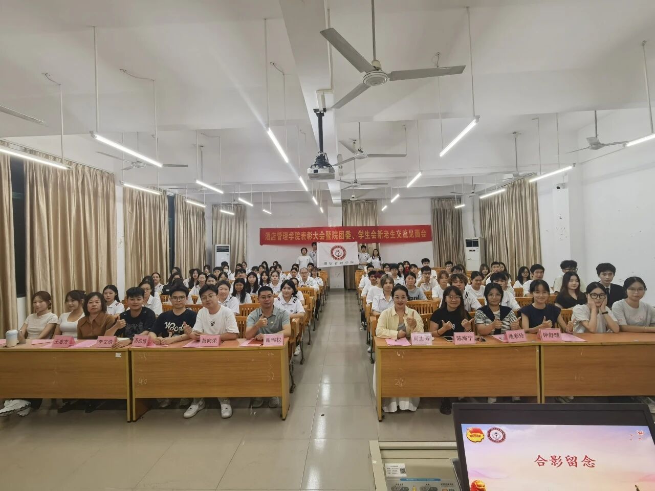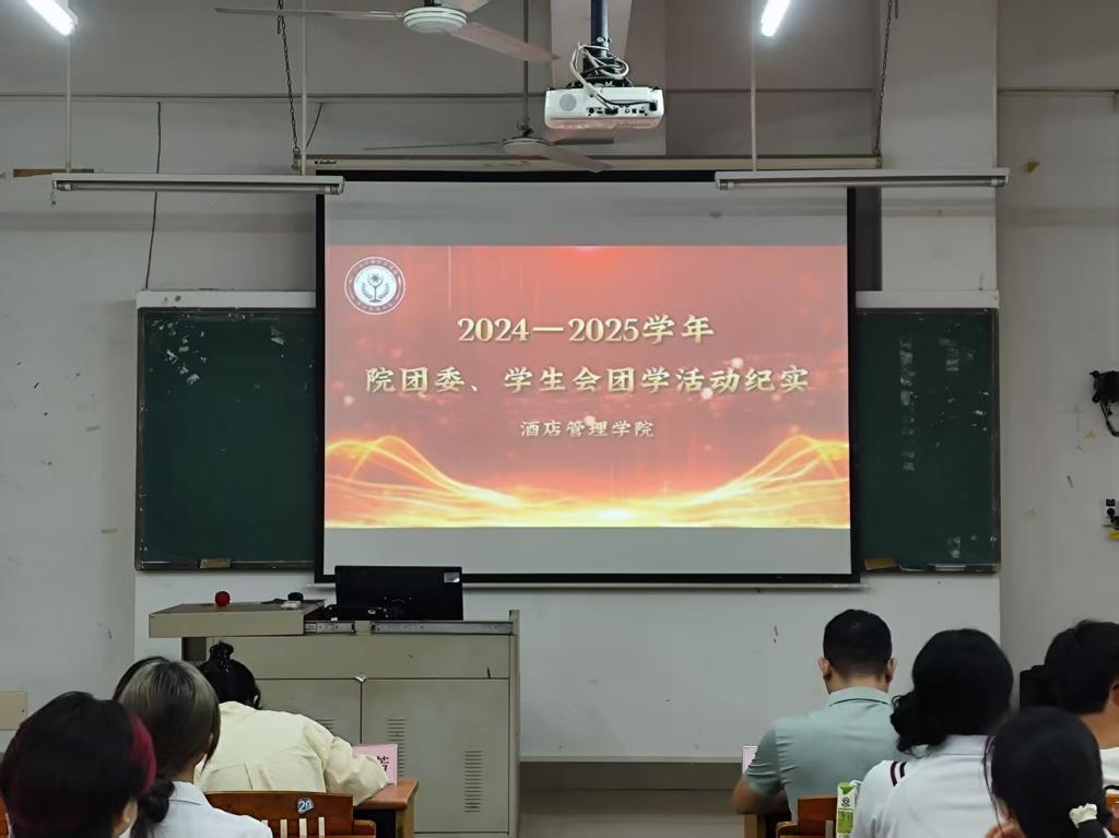为发挥榜样引领作用,表彰先进激励团队,凝聚奋进力量,进一步激发我院团干部的工作积极性与创新力,酒店管理学院于2025年10月16日晚在博A407举行了2024-2025学年团学工作表彰暨院团委、院团委学生会全体新老生经验交流会。参加活动的师生有:酒店管理学院副院长谢锦权,辅导员黄向荣、陈海宁、潘彩玲、周志芳、苏浩博老师以及王志方、李文浩老师等班主任代表和学院团学组织新老学生会成员、各班级代表等。