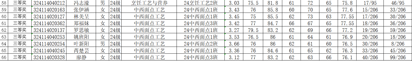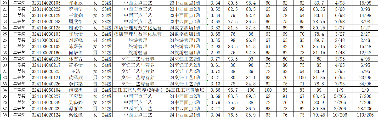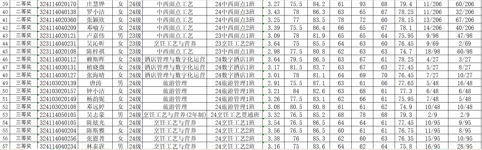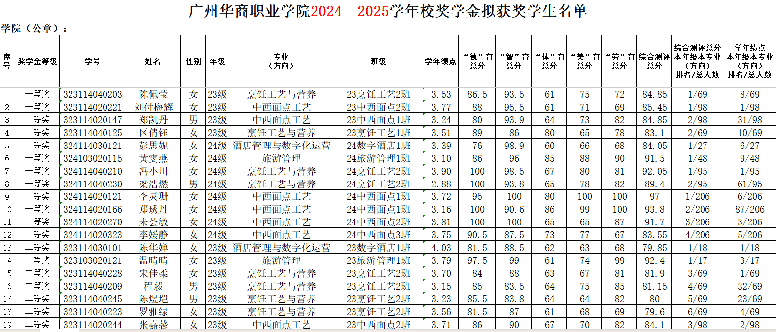 根据《广州华商职业学院学生学年综合测评办法(修订)》华商职学〔〔2024〕14号文件的有关规定及广州华商职业学院校级奖学金评审办法,结合我院上学年各年级各专业(方向)的综合测评名次,本着“公平、公开、公正”的原则,拟评选出本学院校奖学金名单,现将酒店管理学院2024-2025学年校奖学金获奖学生名单评选结果予以公示,具体名单详细如下: