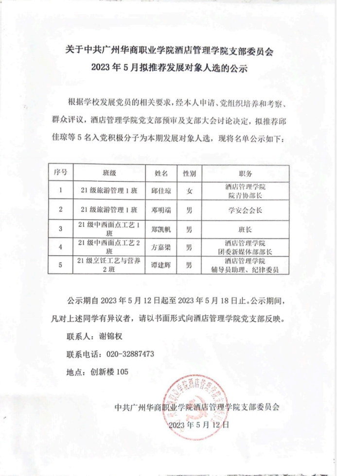 上一条:关于中共广州华商职业学院酒店管理学院支部委员会2023年5月拟吸收预备当员人选的公示