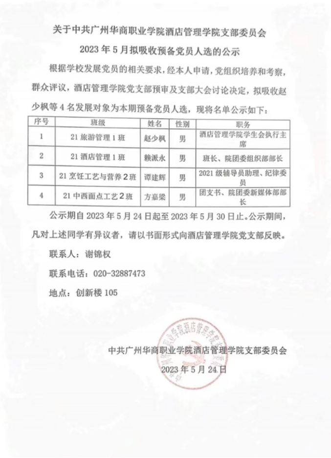 下一条:公示|酒店管理学院党支部5月拟推荐发展对象人选公示