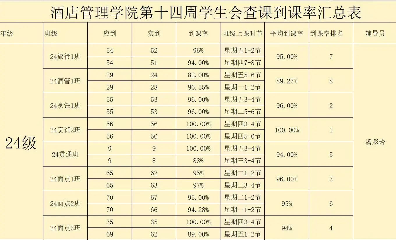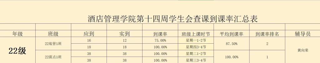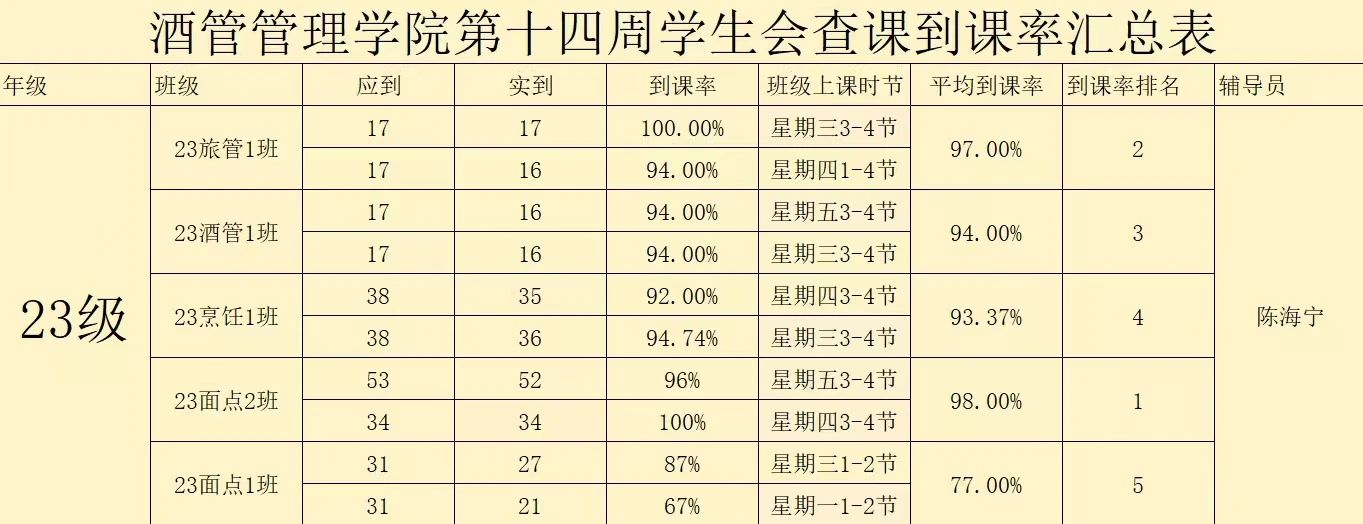 书山有路勤为径,学海无涯苦作舟。以下是酒店管理学院学生会纪检部对我院第十四周的学生到课情况汇总结果: