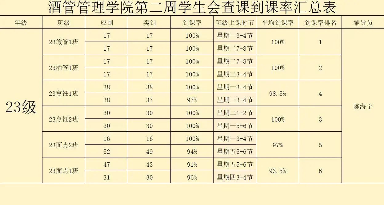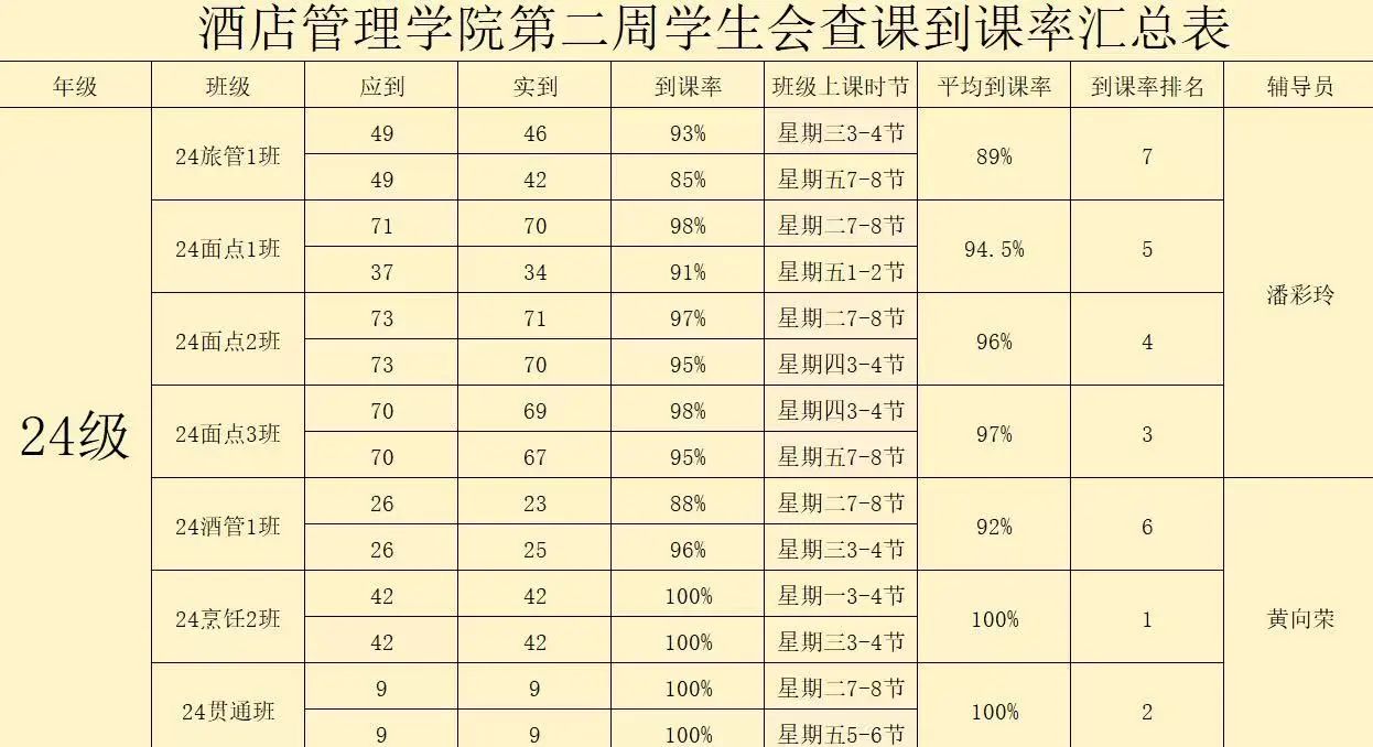书山有路勤为径,学海无涯苦作舟。以下是酒店管理学院学生会纪检部对我院第二周的学生到课情况汇总结果: