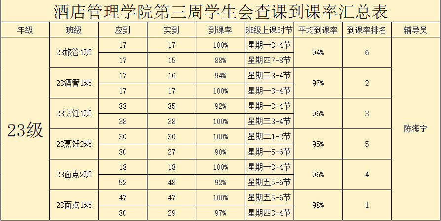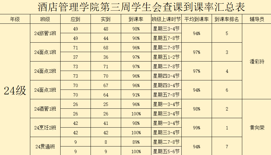 书山有路勤为径,学海无涯苦作舟。以下是酒店管理学院学生会纪检部对我院第三周的学生到课情况汇总结果: