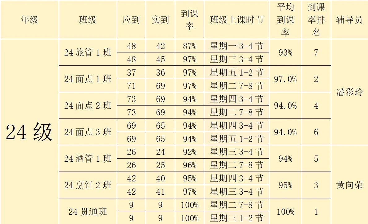 以上是第七周的到课率汇总,本次查课活动充分展现了学生们积极进取的精神风貌。希望同学们能够继续保持良好的学习习惯,认真对待接下来的每一堂课,在新学期争做更优秀的自己,砥砺前行,不负韶华!