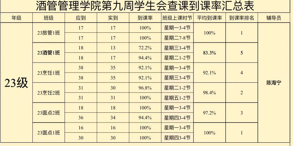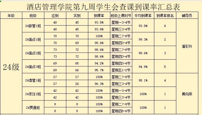 书山有路勤为径,学海无涯苦作舟。以下是酒店管理学院学生会纪检部对我院第九周的学生到课情况汇总结果: