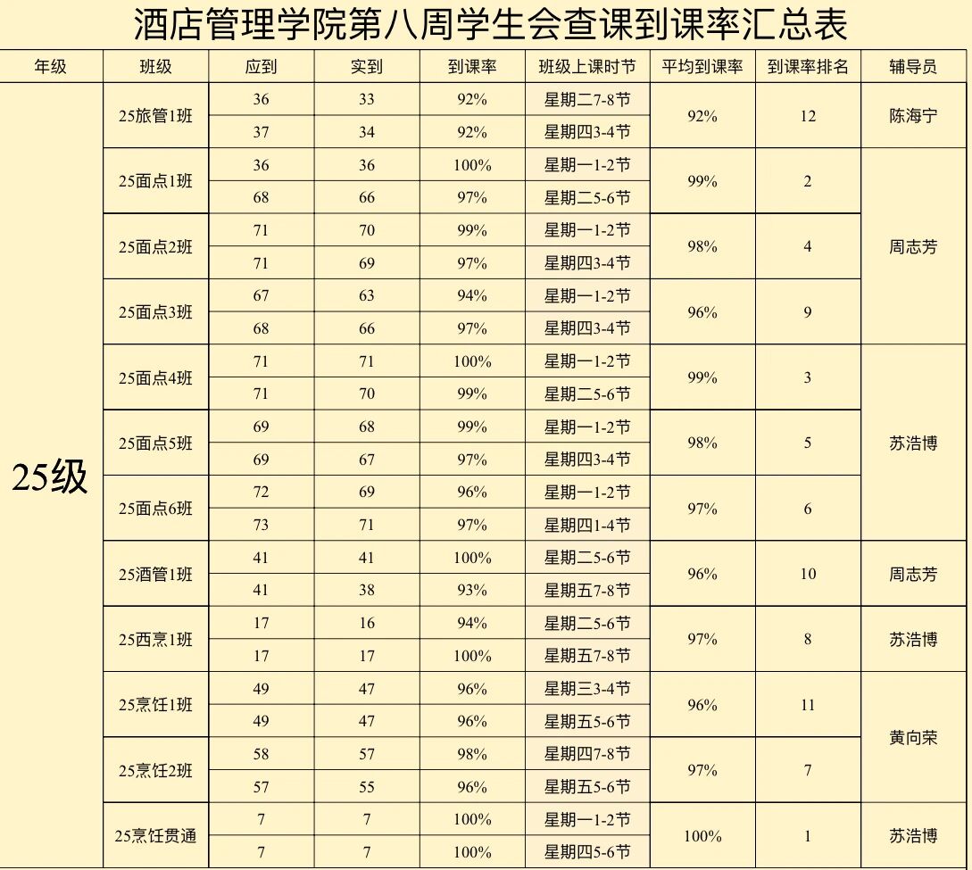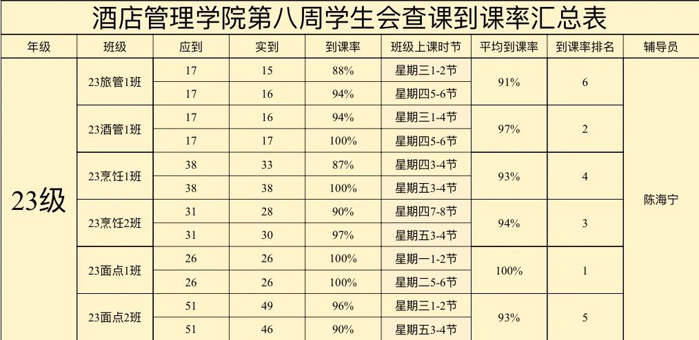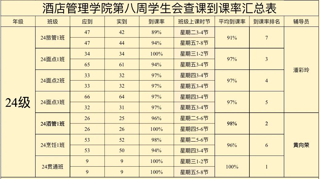 酒店管理学院第八周到课率