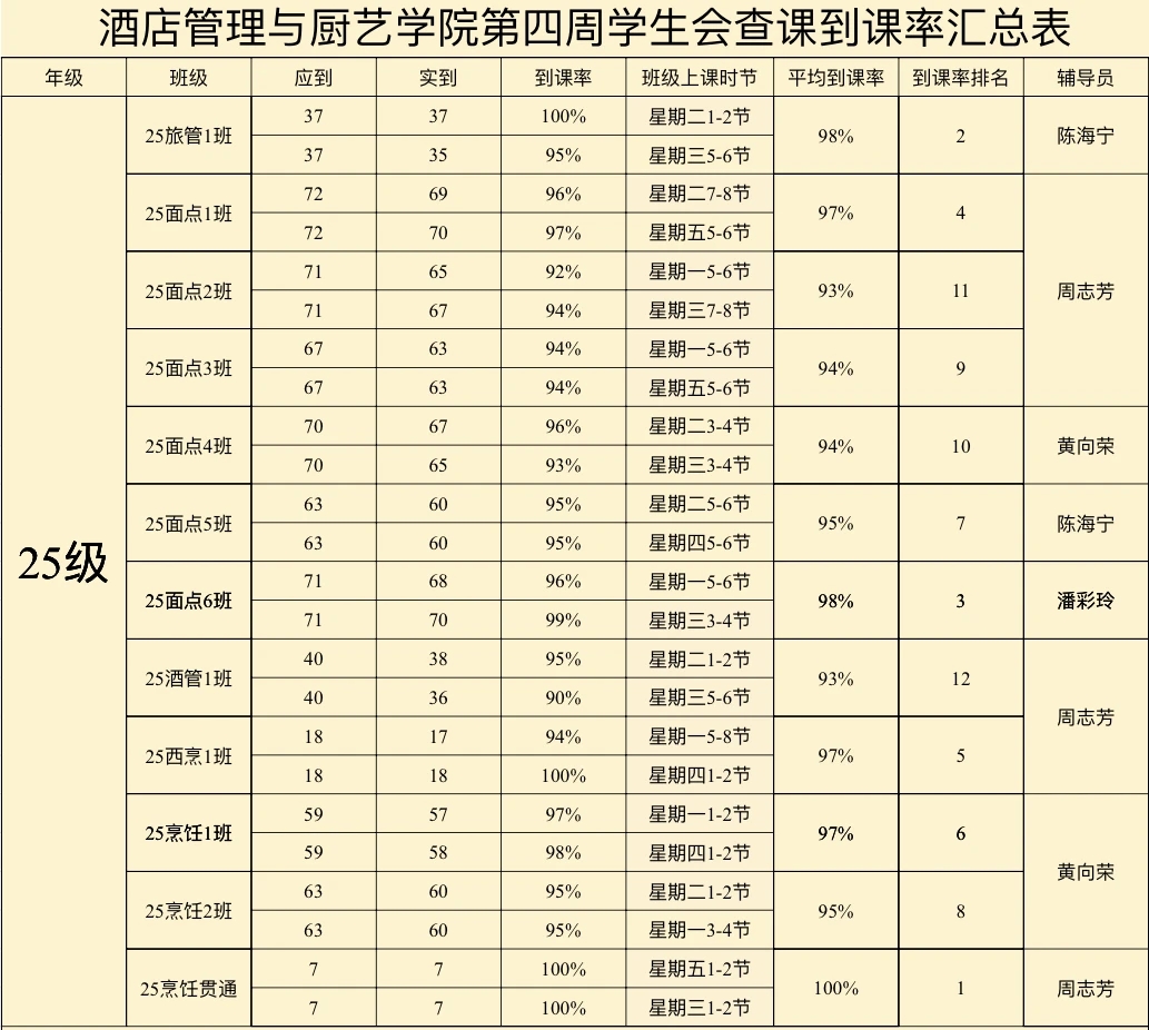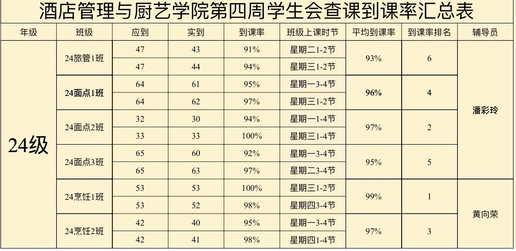酒店管理与厨艺学院第四周到课率