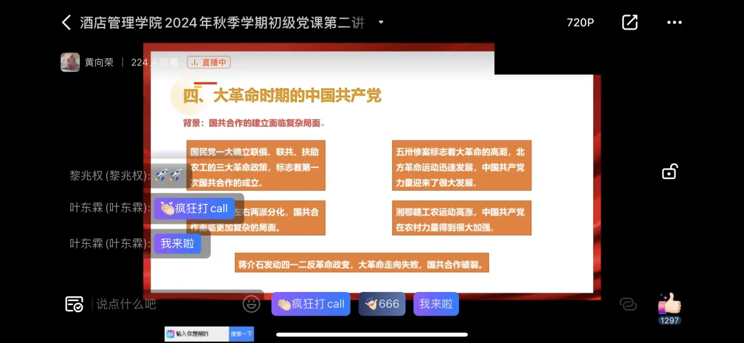 为深入学习中国共产党的光辉历程,增强青年学生的历史使命感和责任感,酒店管理学院直属党支部于9月24日中午在创教101开展了初级党课第二讲。党校师资库孟繁泽老师主讲,我院24中西面点1班、24级烹饪工艺与营养贯通班和24级烹饪工艺与营养1班全体同学现场参加了党课,其他同学则通过钉钉平台在线同步学习。